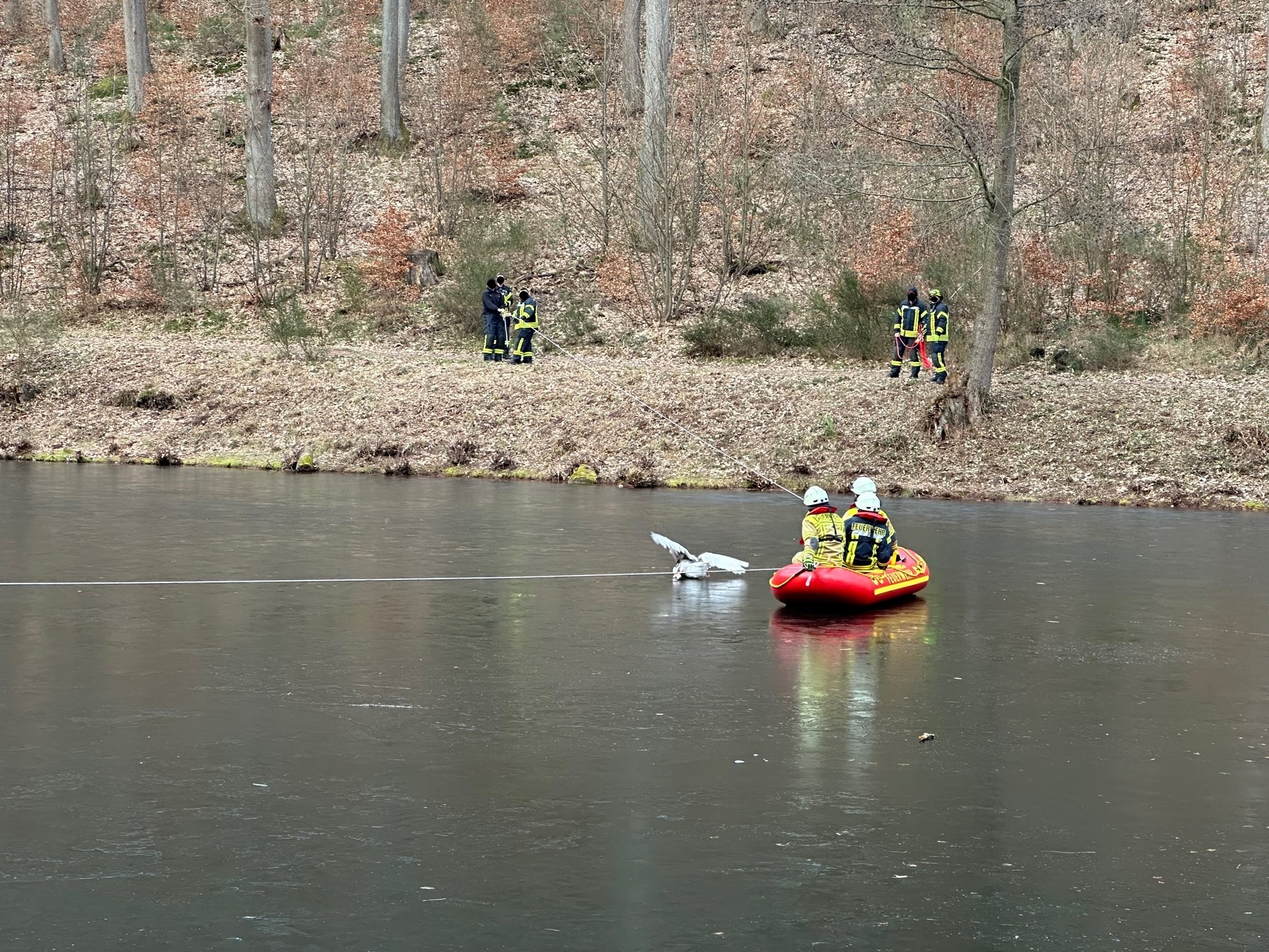 Die Beamten sahen nach dem Rechten und stellten den stattlichen Ganter tatsächlich mitten auf dem vereisten See fest. Das entkräftete Tier schaffte es nicht mehr, die spiegelglatte Eisfläche eigenständig zu verlassen. Die zuvor verständigte Feuerwehr konnte das Tier schließlich mit Hilfe eines Schlauchbootes, das über die brüchige Eisfläche gezogen wurde, aus seiner misslichen Lage befreien. Die hinzugekommene Tierhalterin, eine 54-Jährige aus der Verbandsgemeinde Maikammer, war über die Rettung ihres "Heinrichs" überglücklich und bedankte sich herzlich bei den Einsatzkräften.