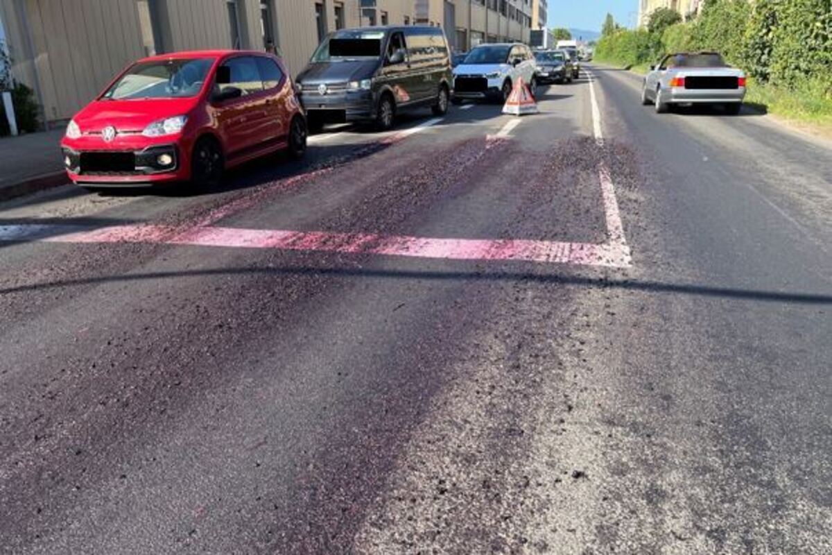 In der Folge kam es aufgrund der massiven Fahrbahnverschmutzung zum Sturz eines Motorradfahrers, wobei glücklicherweise nur leichter Sachschaden am Motorrad entstand. Die Fahrbahn musste durch die Feuerwehr gesäubert werden. Hierbei kam es auch kurzzeitig zu Verkehrsbeeinträchtigungen.