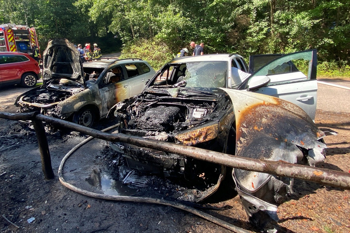 In Edenkoben sind am Donnerstag, 7. August 2025, auf einem Parkplatz zwei Autos in Brand geraten. Ein VW Golf fing offenbar zuerst Feuer, anschließend griffen die Flammen auf einen Audi über. Beide Motorräume brannten komplett aus.