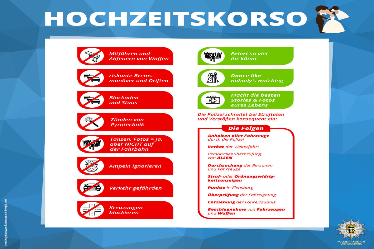 Das Polizeipräsidium Ludwigsburg hat Verständnis dafür, dass freudige Ereignisse gebührend gefeiert werden. Gerade bei Hochzeiten haben sich dabei gewisse Bräuche etabliert, die im Regelfall auch toleriert werden, z.B. das Betätigen der Hupe nach Fahrten im Anschluss an eine Trauung. Nicht mehr toleriert werden kann jedoch ein Verhalten, durch das andere Personen übermäßig belästigt oder gar gefährdet werden.