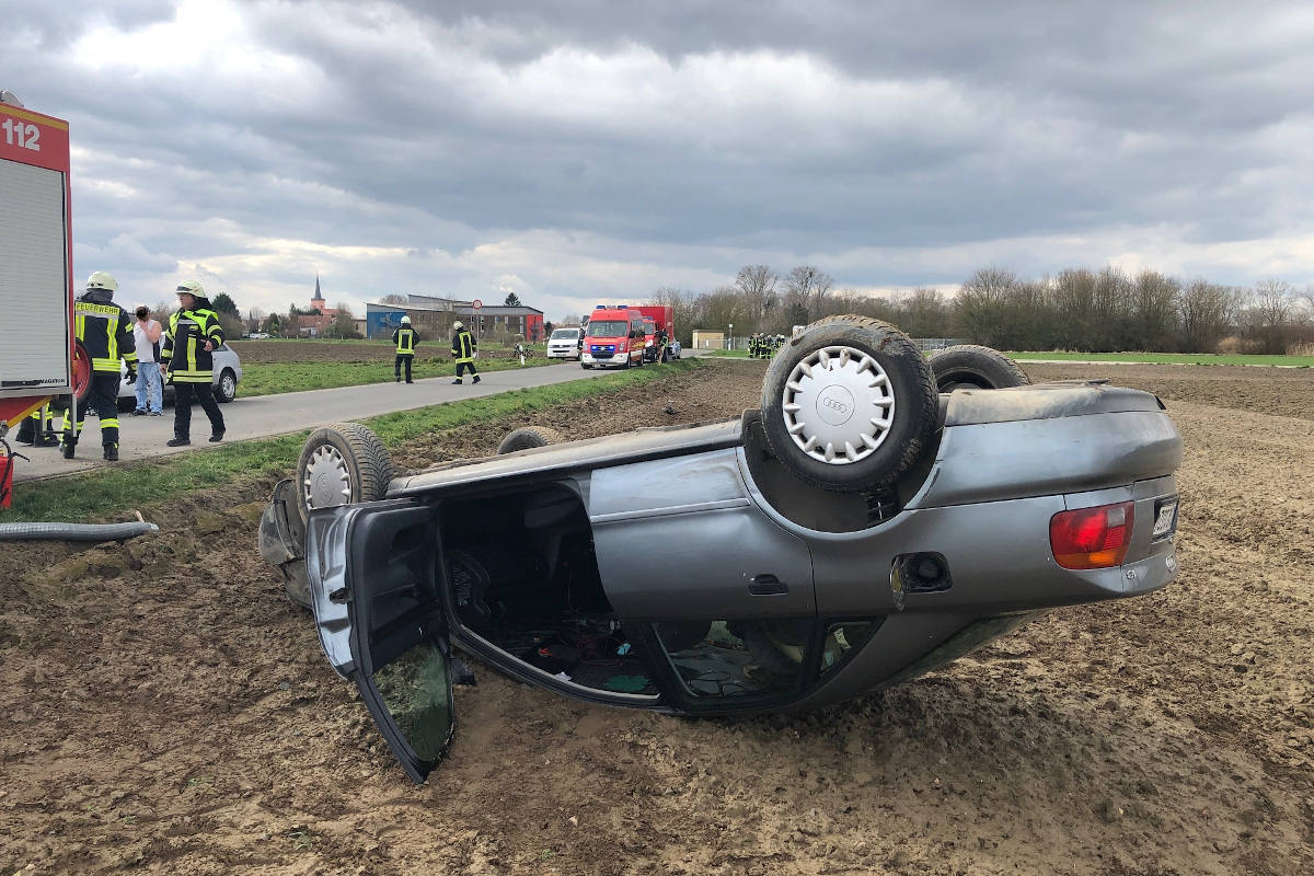 Die Fahrerin eines Audi kam aufgrund vermutlich nicht angepasster Geschwindigkeit im Bereich einer Rechtskurve von der Fahrbahn ab und geriet mit ihrem Fahrzeug auf ein angrenzendes Feld. Hier verlor sie die Kontrolle über ihren Pkw, sodass sich dieser zweimal überschlug und schließlich auf dem Dach des Fahrzeugs liegen blieb.