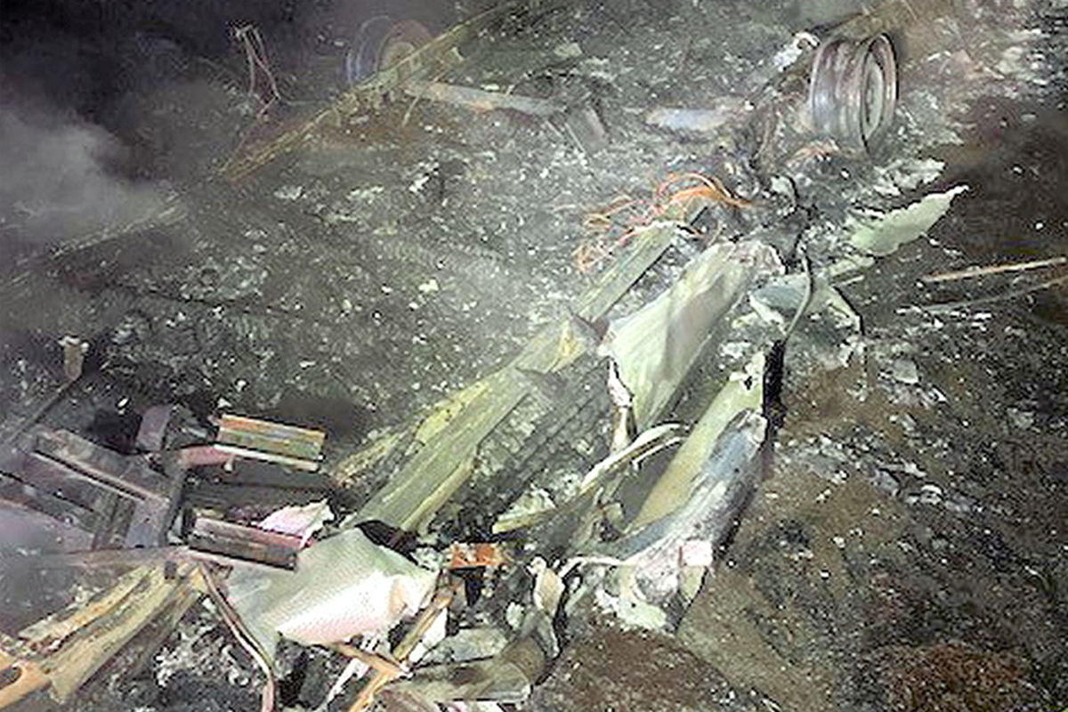 Beim Eintreffen der Feuerwehr war der Wohnwagen bereits vollständig abgebrannt. (Bildquelle: Polizeidirektion Kaiserslautern)