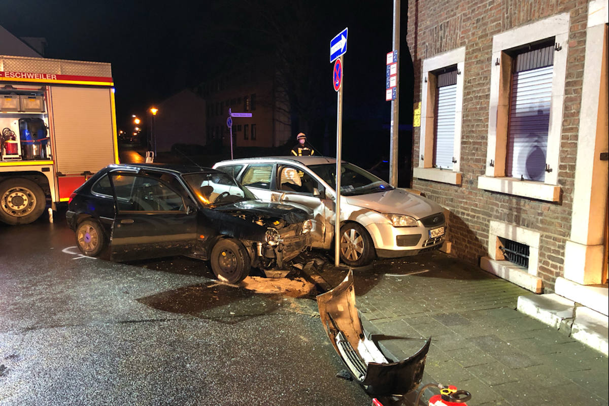 Gegen 21:30 Uhr fuhren ein 45jähriger und seine 38jährige Beifahrerin, beide aus Eschweiler, auf der Gasthausstraße in Richtung Jülicher Straße. Dabei übersah der Mann den Pkw eines 19jährigen Stolbergers, der aus der Konrad-Adenauer-Straße kam. Die beiden Fahrzeuge stießen im Kreuzungsbereich zusammen. Durch den Aufprall schleuderten die Autos gegen einen Verteilerkasten, der hierdurch ebenfalls beschädigt wurde.