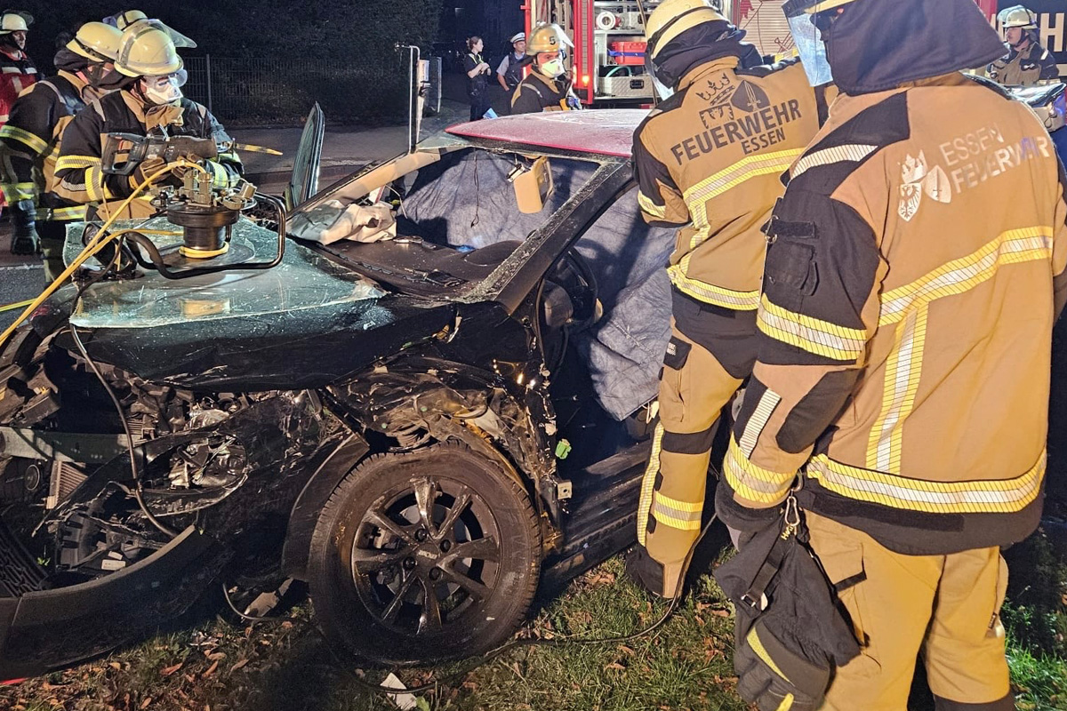 Die Feuerwehr Essen leitete umgehend technische Rettungsmaßnahmen ein, stabilisierte das Fahrzeug und befreite beide Insassen in enger Abstimmung mit dem Rettungsdienst.
