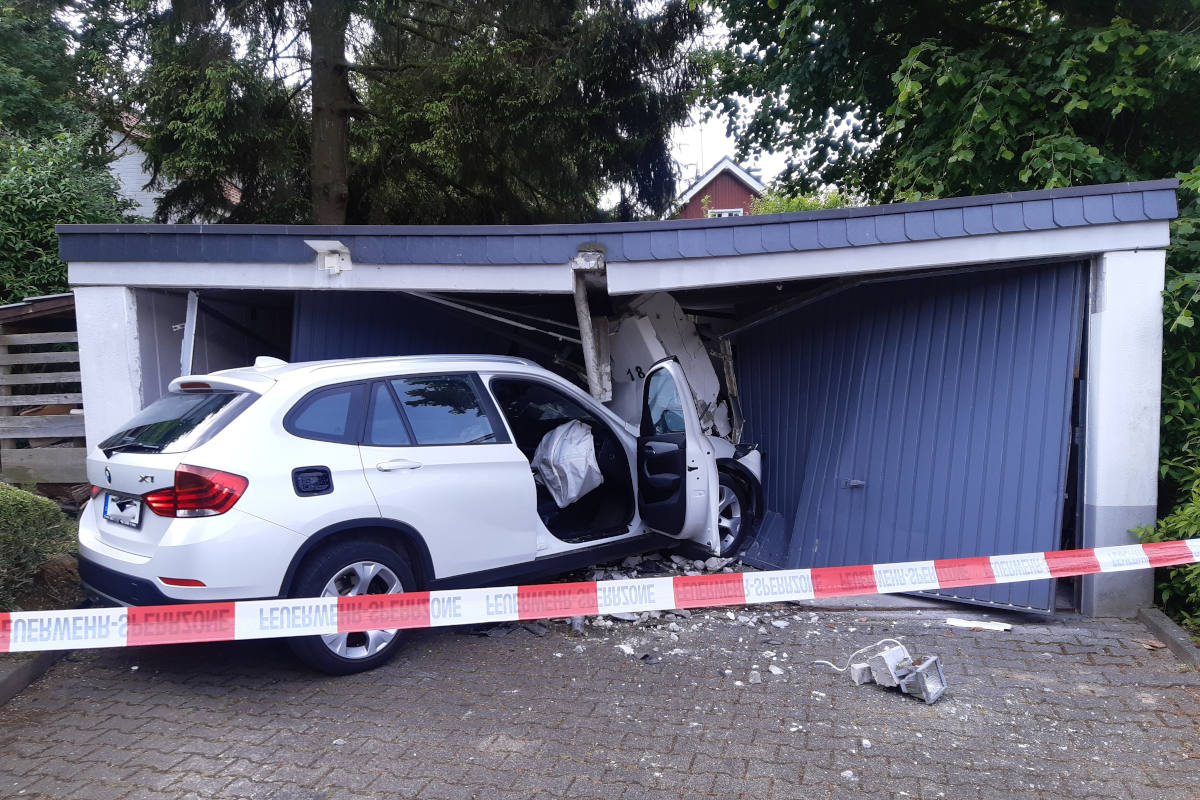 Die ersten Kräfte sahen einen BMW X1 der frontal in eine Doppelgarage geprallt war. Aufgrund der vorgefundenen Lage wurden weitere Kräfte nachalarmiert. Die 74-jährige Fahrerin konnte von der Rettungsdienstbesatzung aus dem Fahrzeug befreit werden. Die Patientin wurde bei dem Unfall augenscheinlich nur leicht verletzt. Um weitere Verletzungen auszuschließen, erfolgte ein Transport mit Notarztbegleitung in ein Krankenhaus.