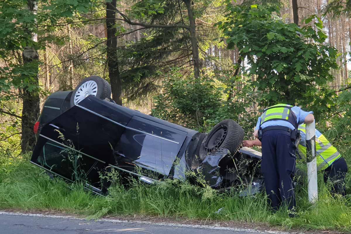 In einer scharfen Kurve hatte die Fahrerin die Kontrolle verloren. Das Fahrzeug überschlug sich und blieb in der Grünböschung auf dem Dach liegen. Da erste Notrufe von mehreren Verletzten und sogar eingeklemmten Personen berichteten, wurden mehrere Einheiten der Feuerwehr alarmiert.