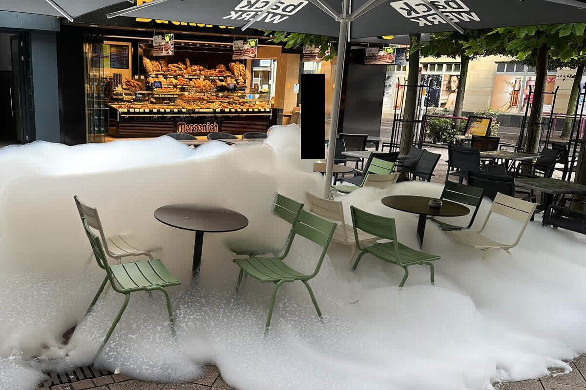 Bei Eintreffen der Polizei gegen 08.00 Uhr war der Schaumteppich bereits über den Brunnenrand getreten und teilweise in die Fußgängerzone gelaufen.
