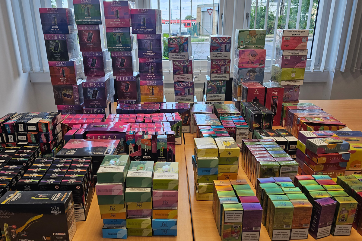Der Aachener Zoll stellte vor zwei Wochen in einem Euskirchener Kiosk insgesamt 836 unversteuerte und teilweise nicht verkehrsfähige E-Vapes sowie über 1 Kilo Wasserpfeifentabak sicher, der ebenfalls keine Steuerbanderole trug.