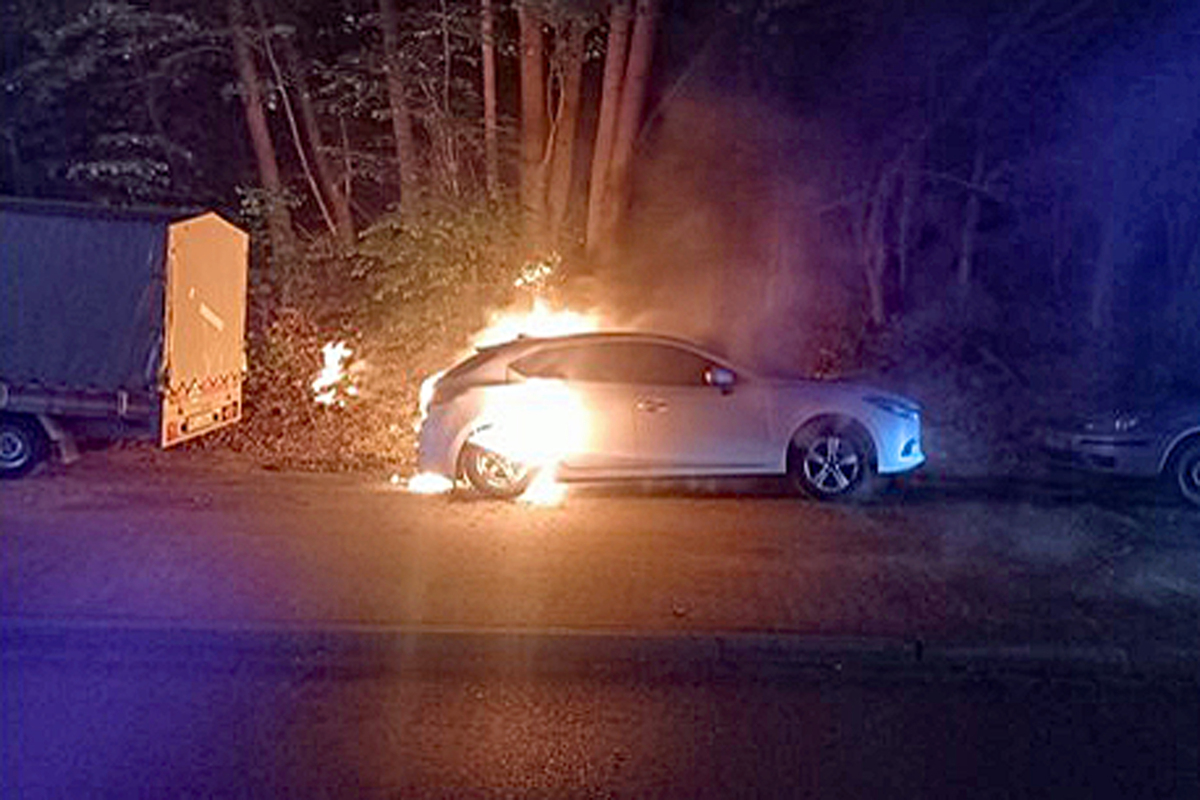 Gegen 00 Uhr wurden die Einsatzkräfte der Polizei sowie der Feuerwehr der Stadt Ratingen über einen Fahrzeugbrand am Breitscheider Weg informiert. Bei ihrem Eintreffen stellten sie fest, dass ein weißer Mazda 3, welcher in Höhe der dortigen Autobahnunterführung am Fahrbahnrand geparkt war, in Vollbrand stand.