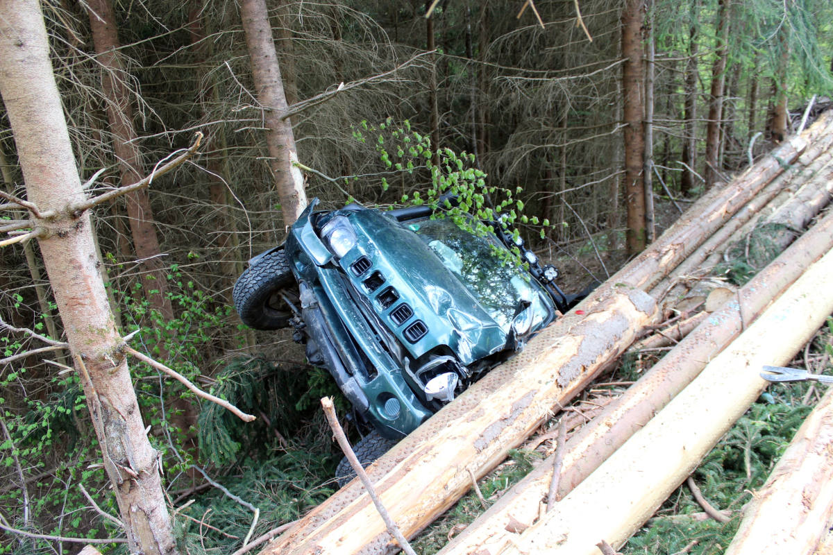 Ein Rettungshubschrauber flog den 75-Jährigen in ein Krankenhaus. Die Feuerwehr barg den Geländewagen. Dieser war komplett deformiert und es entstand ein Sachschaden im fünfstelligen Eurobereich. In dem Fahrzeug befand sich auch ein Dackel, der durch Ersthelfer befreit und versorgt wurde.