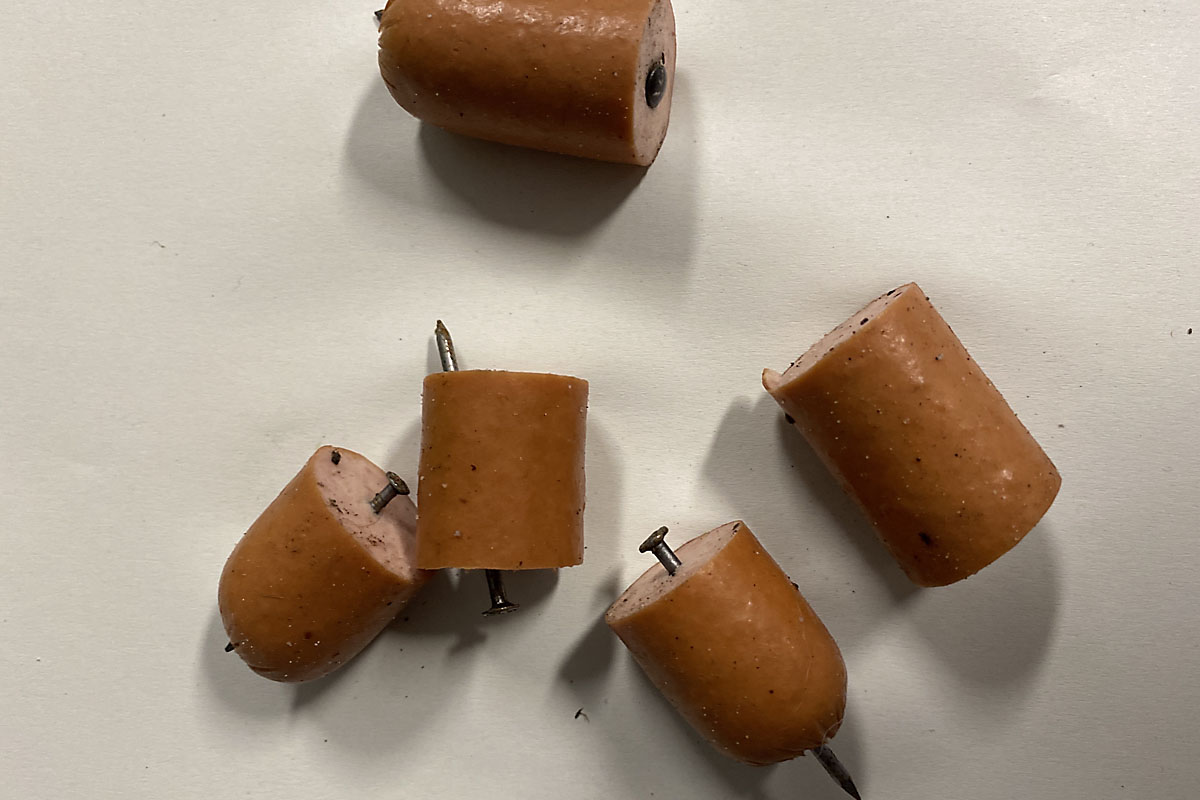 Der Köder wurde am Mittwoch gefunden und war mit Holzspießen, Angelsehne und Stricken versehen. Glücklicherweise kam kein Tier zu Schaden.