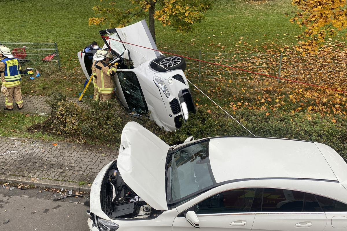 Bei Eintreffen am Unfallort war eine männliche Person bereits durch den eingetroffenen Rettungsdienst zusammen mit Ersthelfern aus dem Fahrzeug befreit worden. Die zweite noch im Fahrzeug befindliche Person klagte über Rückenschmerzen, war jedoch nicht eingeklemmt.