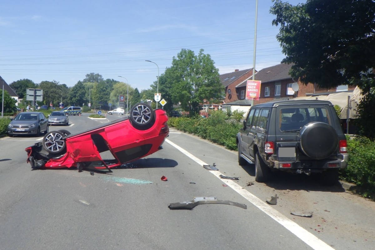 Mit nur leichten Verletzungen kam ein 21-jähriger Autofahrer aus Issum am Montag (18. Juli 2022) davon, nachdem sein PKW bei einem Verkehrsunfall auf dem Dach gelandet war.