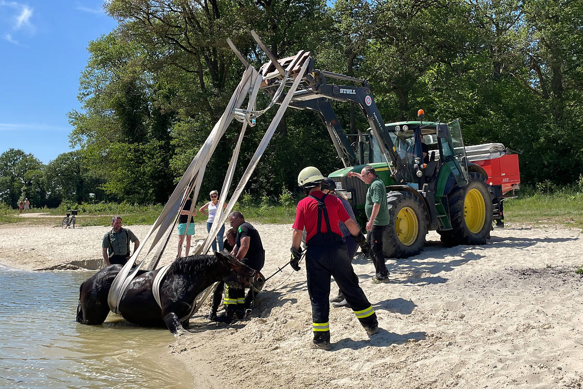 Das Tier geriet in den Spülsand dort und sackte so tief ein, dass es sich nicht mehr befreien konnte. Mit mehreren unter dem Bauch des Pferdes geführten Löschschläuchen und einem Trecker konnte Max, so der Name des Wallachs, vorsichtig angehoben und wohlbehalten ans Ufer gezogen werden.