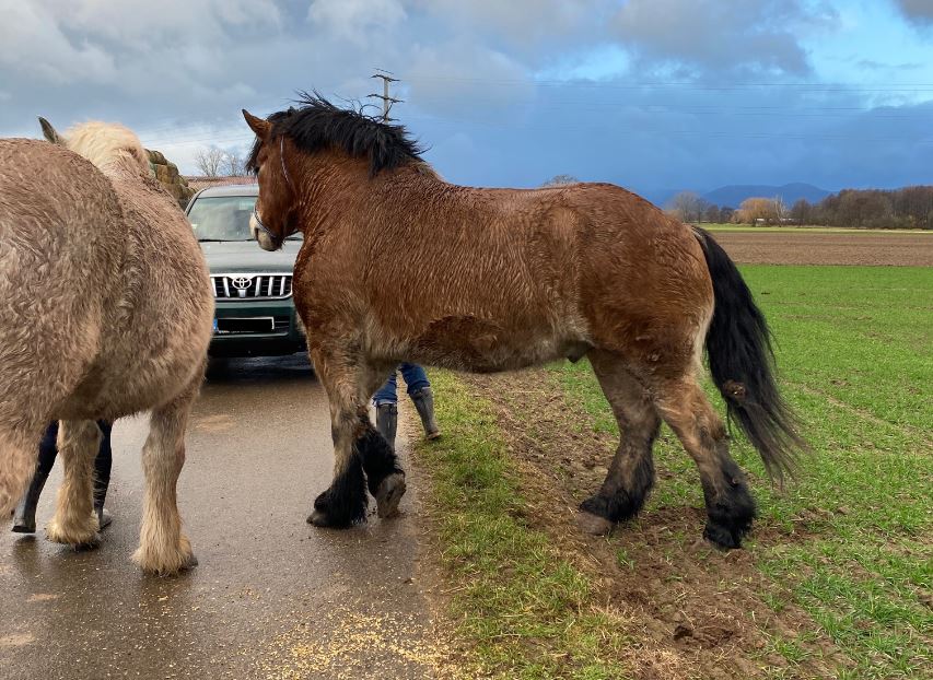Zwei Kaltblüter waren von ihrer Weide ausgebüxt und suchten auf der Straße ihren Auslauf. Zusammen mit mehreren Autofahrern konnten die Tiere eingefangen und auf einer fremden Weide untergebracht werden. Der Tierhalter wird aktuell ausfindig gemacht.