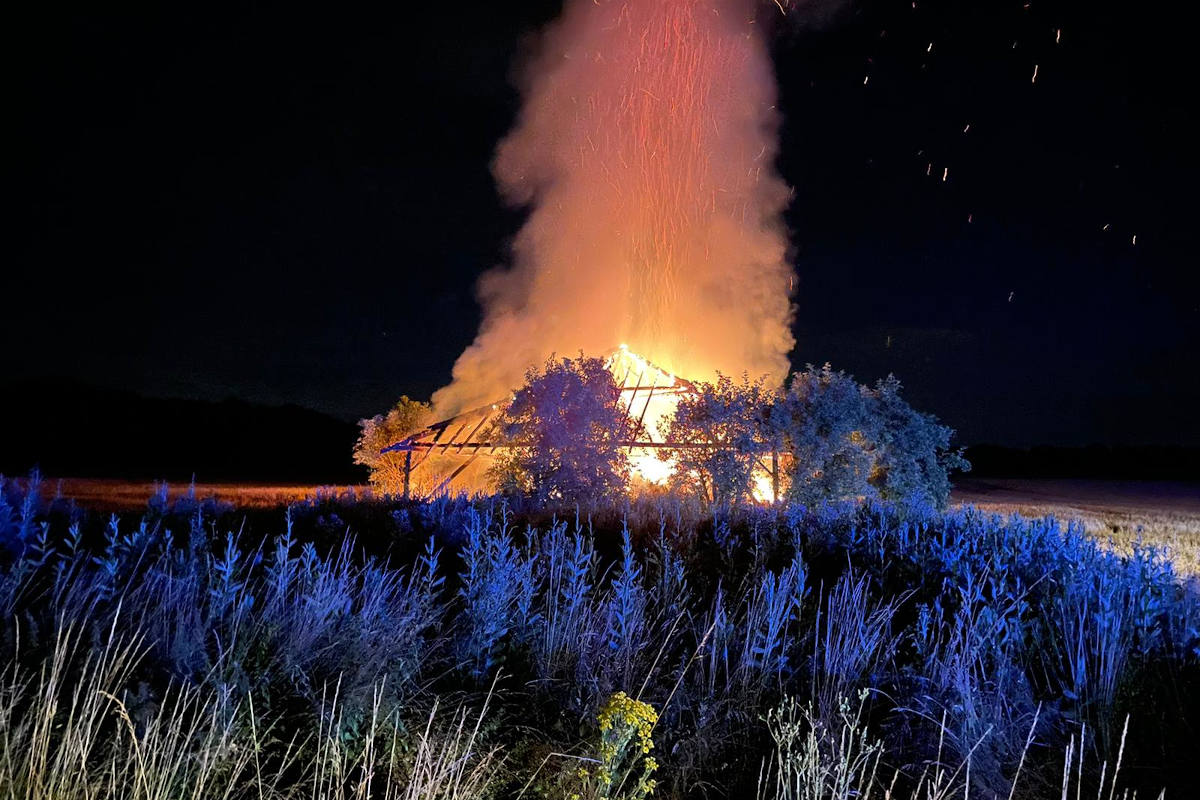 Beim Brand einer rund 200 Quadratmeter großen Feldscheune am Hemmerdener Weg in Höhe des Bauernhofes Zweifaltern Nahe des Ortsteils Kapellen sind in der Nacht zu Donnerstag (8.7.21) Teile der Futter- und Strohvorräte des Grevenbroicher Tiergeheges im Bend verbrannt.