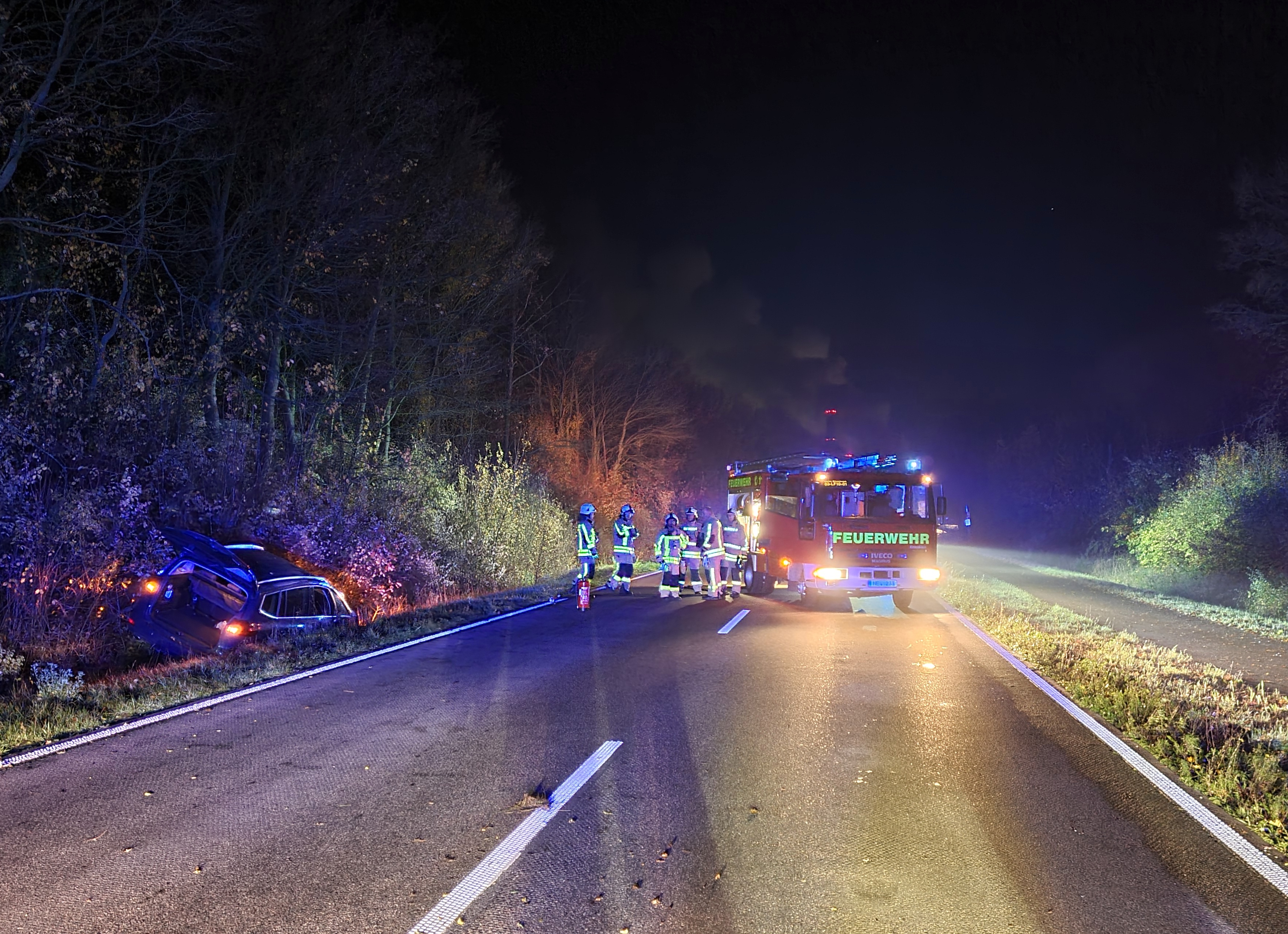 Beim Eintreffen der ersten Kräfte konnte die Meldung bestätigt werden. Der Fahrer eines PKW war mit seinem Fahrzeug in Fahrtrichtung Neurath in den linken Straßengraben gerutscht. Durch den Erdwall des Grabens konnte der Fahrer die Türen nicht mehr öffnen. Zusammen mit dem Rettungsdienst wurde die Person durch ein Fenster aus dem PKW befreit. Der Fahrer wurde durch den Rettungsdienst in ein Krankenhaus gebracht. Die Feuerwehr sicherte die Unfallstelle ab.