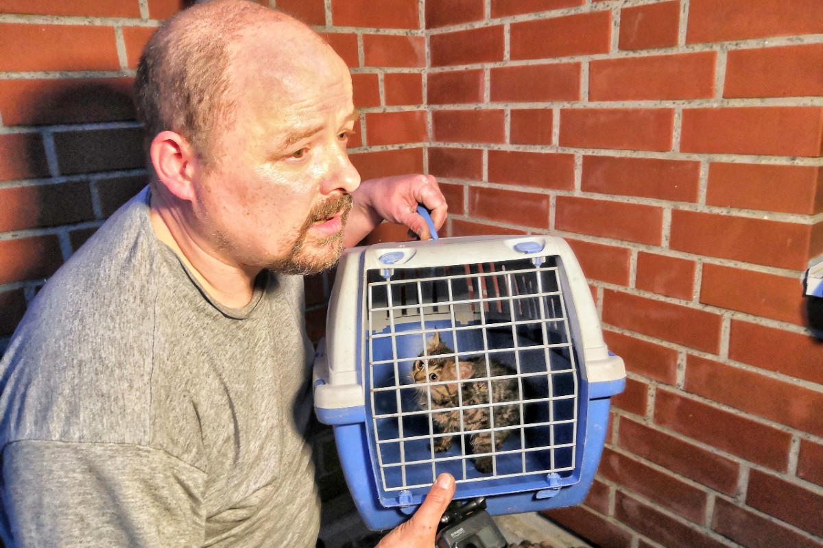 Es war vermutlich durch einen Regenablauf auf dem Dach in ein Abflussrohr gestürzt und konnte sich von dort nicht mehr befreien. In der späten Dämmerung schließlich gelang es den Rettern, das zerzauste Katzenbaby aus einem der Regenablaufrohre unter dem Boden einer Lagerhalle zu ziehen.