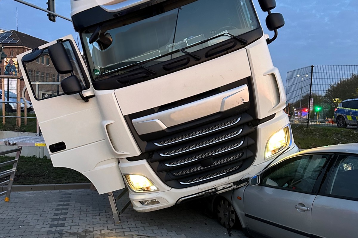 Zum Zeitpunkt des LKW-Unfalls waren die Kräfte der hauptamtlichen Wache sowie der ehrenamtlichen Löscheinheiten aus Stadtmitte und Gustorf/Gindorf noch im ersten Einsatz gebunden. Daher übernahmen die zur Wachbesetzung auf die Hauptwache alarmierten Ehrenamtler aus Wevelinghoven die Einsatzstelle an der Grevenbroicher Straße. Dort war ein LKW an einer Ampelkreuzung geradeaus gefahren und mit der Zugmaschine über eine Mauerkante auf einen tiefergelegenen Parkplatz und einen dort abgestellten PKW gestürzt. Aufgrund der Lage wurden auch die Löscheinheiten aus Hemmerden und Kapellen zur Unterstützung nachgefordert.