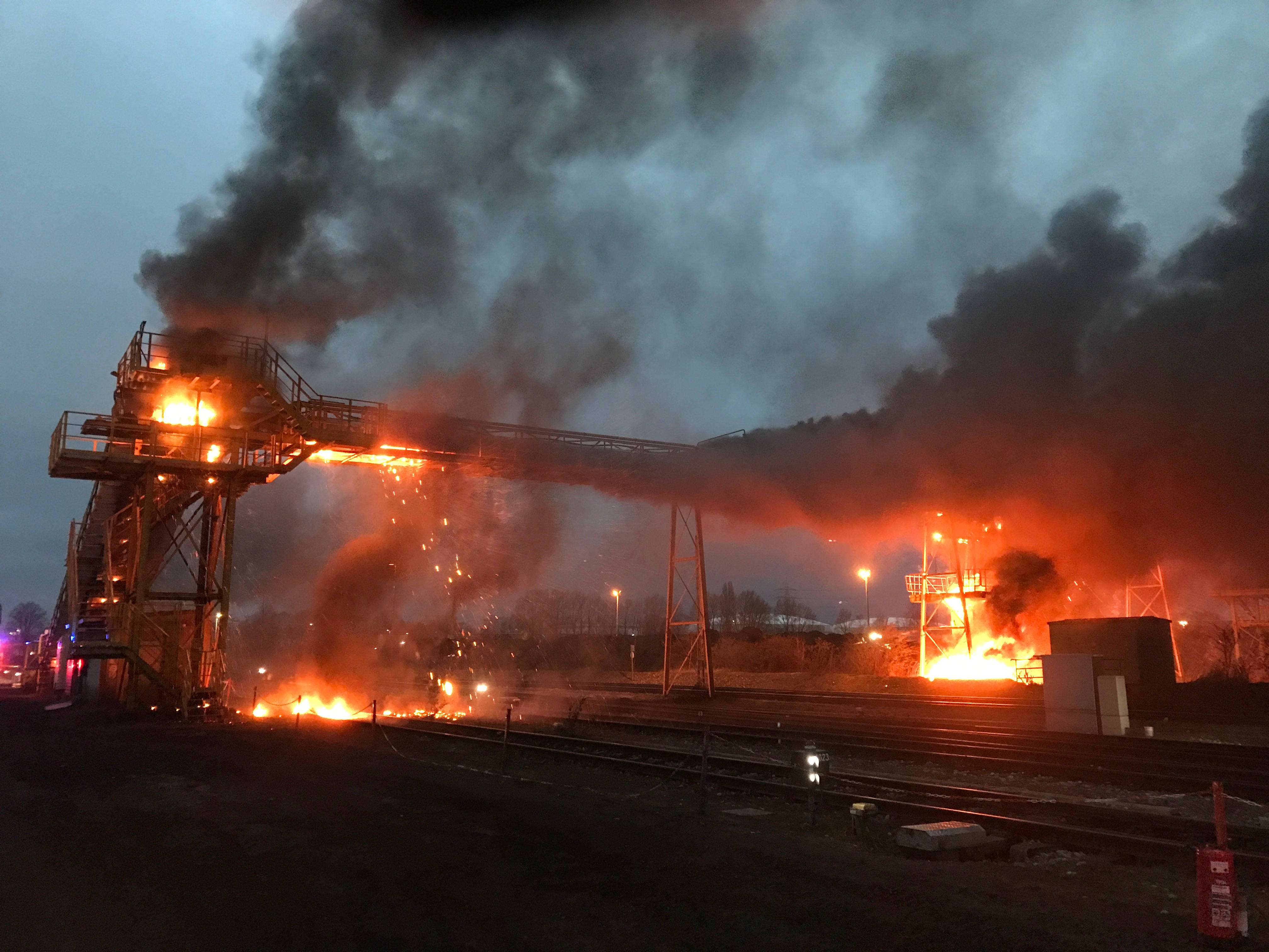 Im Kohlehafen Bottrop brach ein Brand aus, der eine Förderbandbrücke zerstörte. Dank massivem Wassereinsatz konnte eine weitere Ausbreitung des Feuers verhindert werden.