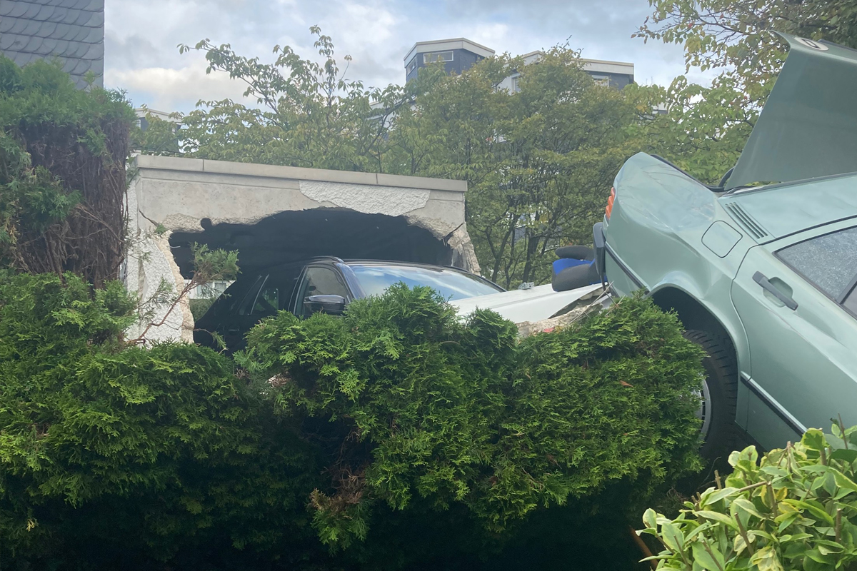 In Haan durchbrach am 03.09.2025 ein 76-jähriger BMW-Fahrer ein Garagentor. Das in der Garage abgestellte Auto wurde durch die Rückwand gedrückt und prallte gegen ein angrenzendes Haus. Verletzt wurde niemand, der Sachschaden ist jedoch erheblich.