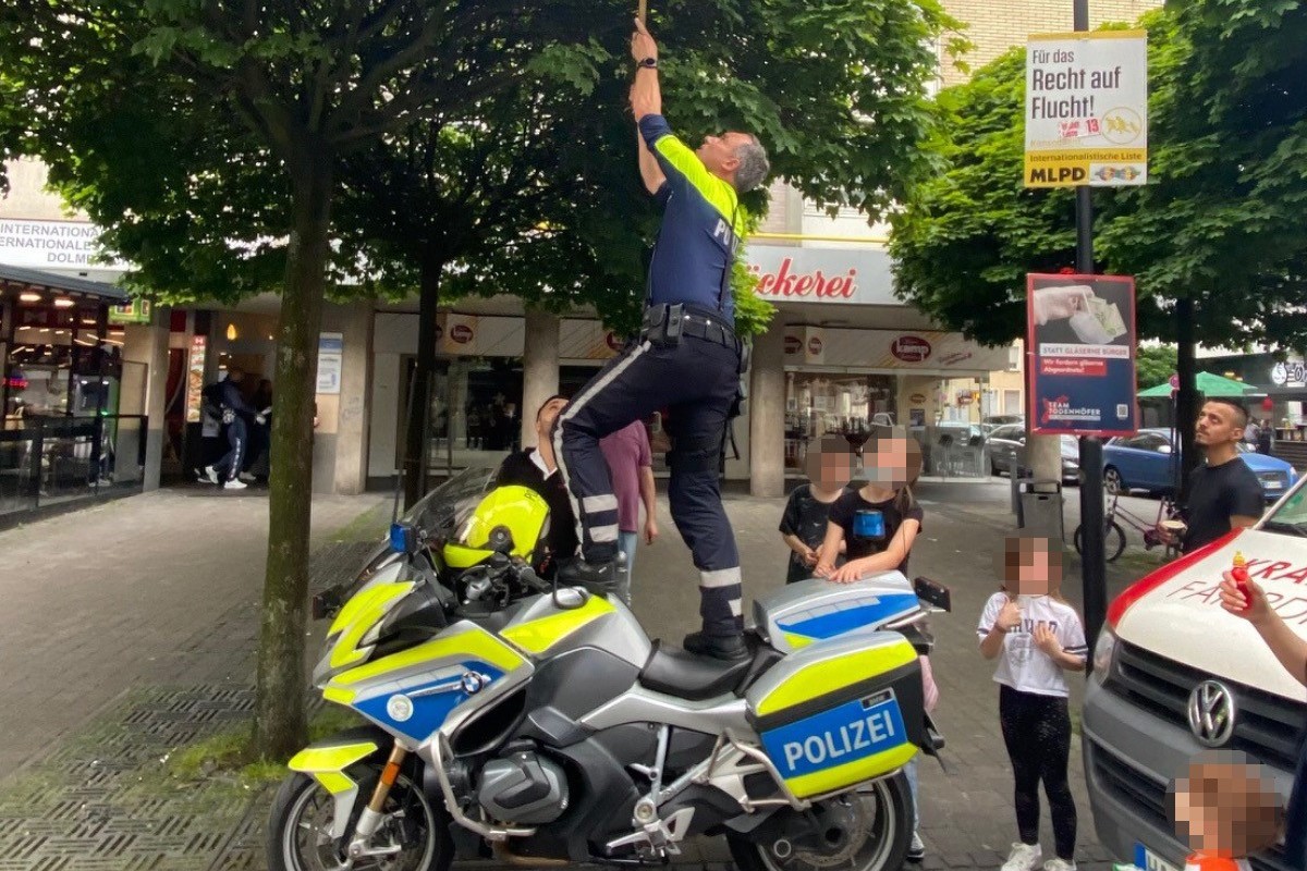 Am Freitag, 03.06.2022, flog der Ball spielender Kinder gegen 19 Uhr so hoch in einen Baum, dass er dort stecken blieb. Selbst mit einer langen Stange war er nicht mehr zu befreien. Ein Motorradpolizist nahm sich der Sache an und funktionierte sein Dienstmotorrad zum Podest um. Mit einer Stange befreite er den Ball zur Freude der Kinder, die anschließend weiterspielen konnten