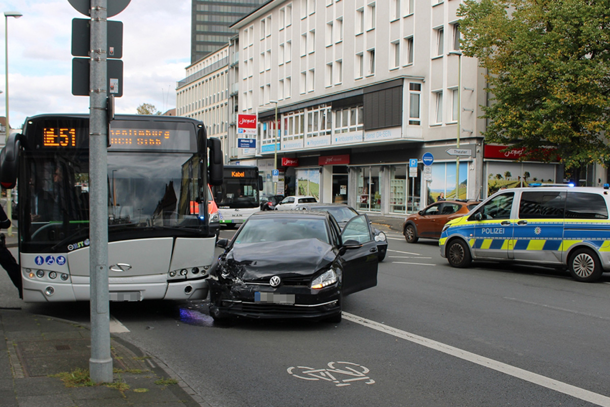 Am Mittwochnachmittag (24.09.2025) stieß in Hagen-Mitte ein VW Golf beim Linksabbiegen mit einem Bus zusammen. Der Autofahrer, sein einjähriges Kind an Bord, sowie Busfahrer und ein Fahrgast wurden verletzt. Der Schaden beträgt rund 8.000 Euro.