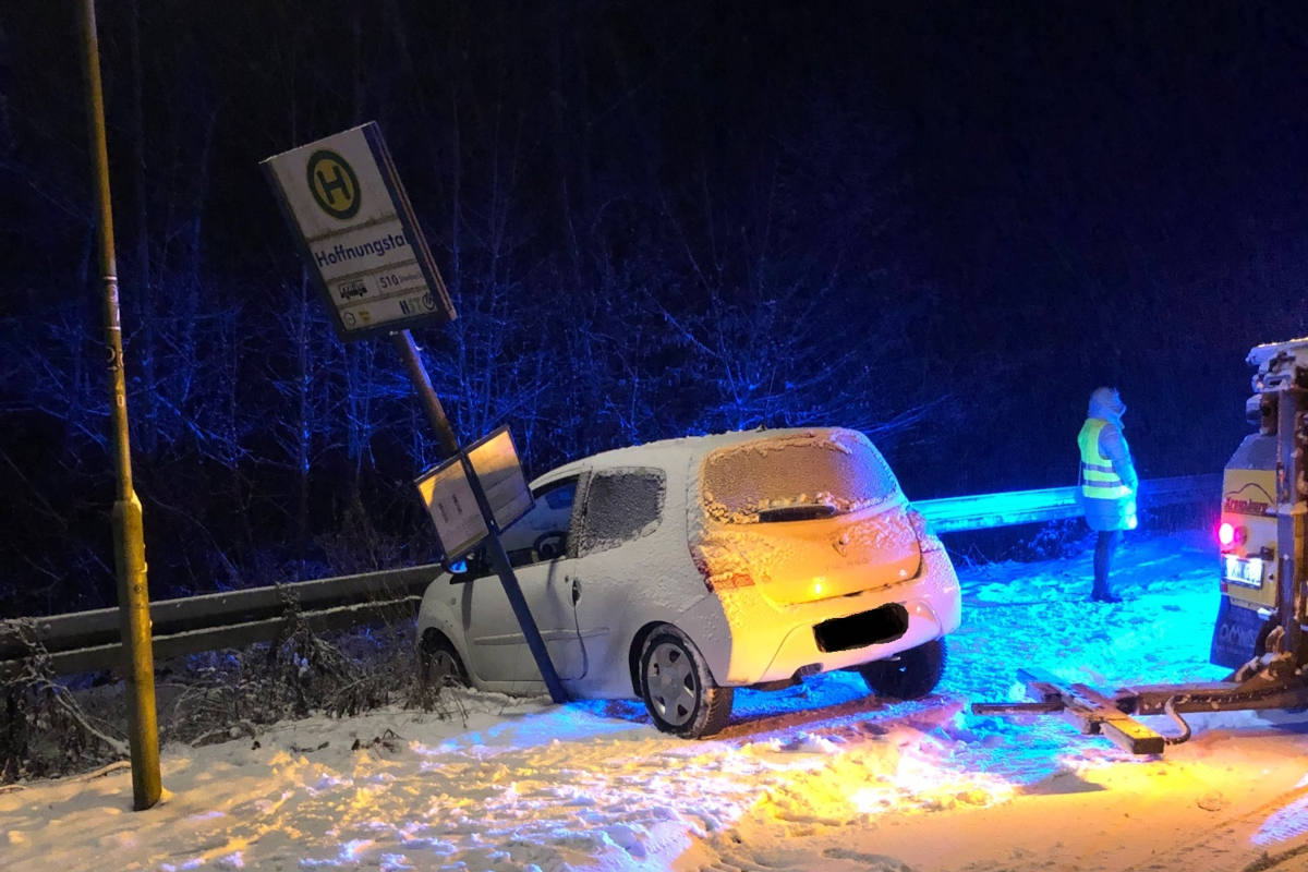 Ein Renault Twingo wurde von der 51-jährigen Halterin über die schneebedeckte Dahler Straße geführt. In Höhe der Einmündung zur Stahlstraße verlor die Fahrerin die Kontrolle über Kleinwagen und geriet ins Schleudern. Das Fahrzeug stellt sich trotz Winterreifen quer, rutschte auf den Gehweg und prallte dort gegen ein Haltestellenschild. Der Renault wurde im Bereich der Fahrertür beschädigt. Das Haltestellenschild "Hoffnungstal" wurde durch die Wucht des Aufpralls in deutliche Schräglage versetzt.