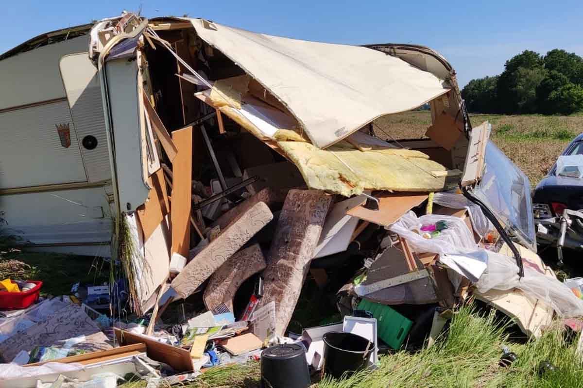 Durch den Unfall wurde der Wohnanhänger im Frontbereich komplett zerstört, sodass für die Zeit der sehr aufwändigen Bergung der Hauptfahrstreifen für 60 Minuten gesperrt werden musste.