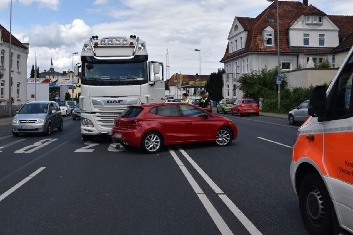 Am Donnerstag (06.07.2023) gegen 13:15 Uhr, kam es auf der Pyrmonter Straße in Hameln in Fahrtrichtung stadtauswärts (auf Höhe der beiden dort befindlichen Tankstellen) zu einem Verkehrsunfall unter Beteiligung eines Bielefelder Sattelzuges und eines roten Hamelner Pkw Seat.