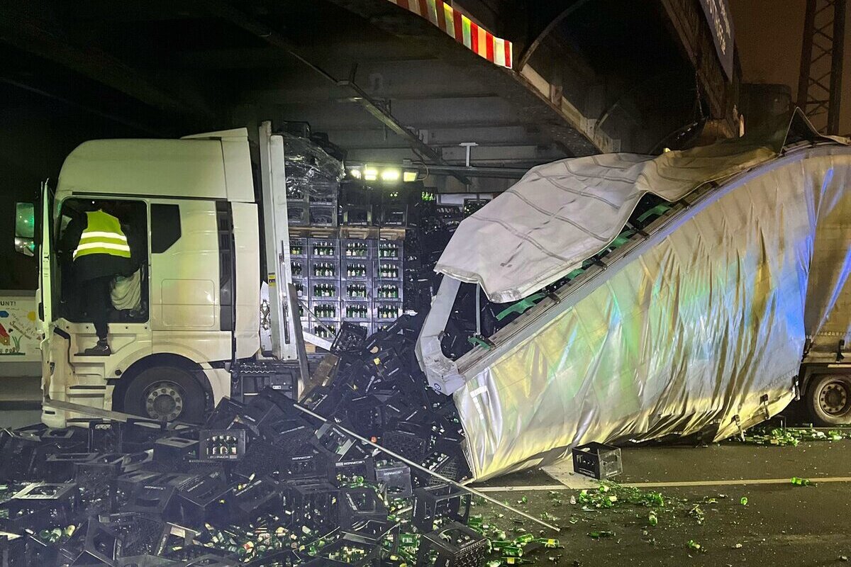 Gegen 17 Uhr befuhr ein 47-jähriger Mazedonier mit seinem Lkw die Wilhelmstraße in östlicher Richtung. Als er die dortige Bahnunterführung passieren wollte, prallte der Sattelzug gegen den Brückenbogen. Durch den Aufprall verkeilte sich der Auflieger und wurde so stark beschädigt, dass ein Großteil des geladenen Leerguts auf die Fahrbahn fiel.
