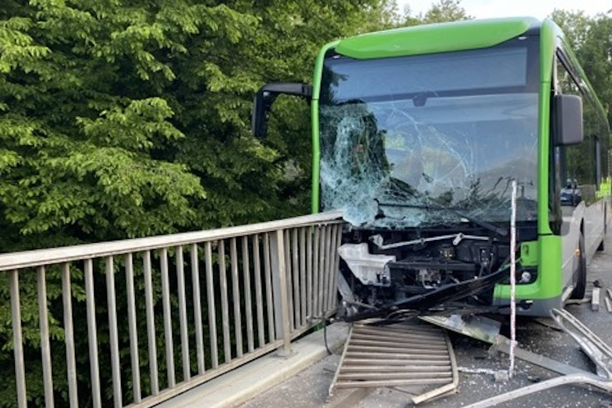 Hannover – Linienbus ragt nach Unfall über Brückenbegrenzung