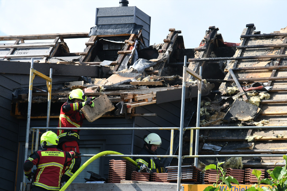 Beim Eintreffen der ersten um 15.19 Uhr alarmierten Feuerwehrkräfte aus Hasloh waren fünf Arbeiter auf dem Dach des eingerüsteten Einfamilienhauses und versuchten, den Brand mit einem Gartenschlauch zu löschen – vergebens.