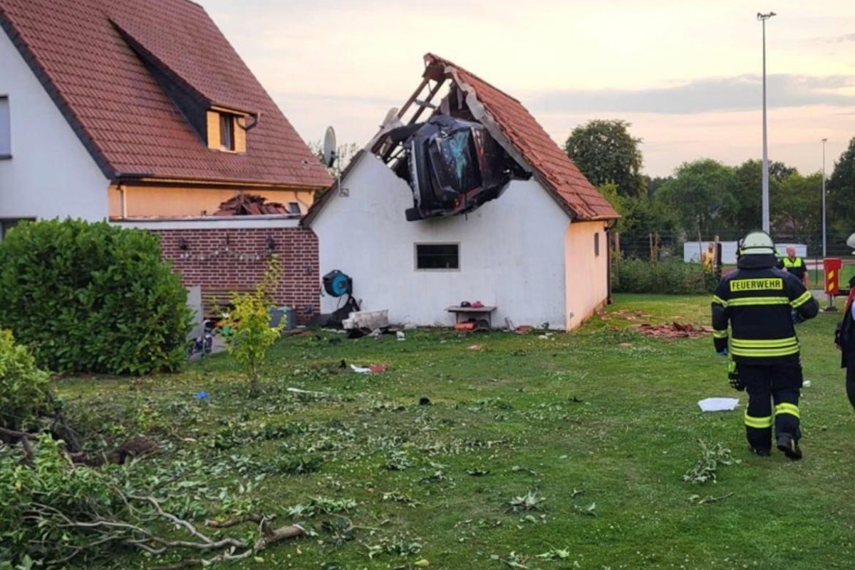 Heftiger Unfall in Bohmte NI: Pkw fliegt in Schuppendach und verletzt spielendes Kind lebensgefährlich