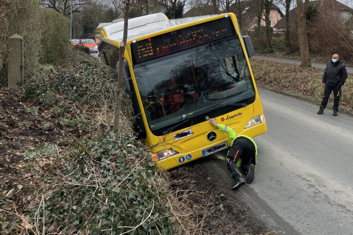 Der Linienbus wurde im Anschluss durch ein Bergungsunternehmen aus dem Straßengraben gezogen und konnte dann aus eigener Kraft in die Werkstatt fahren.