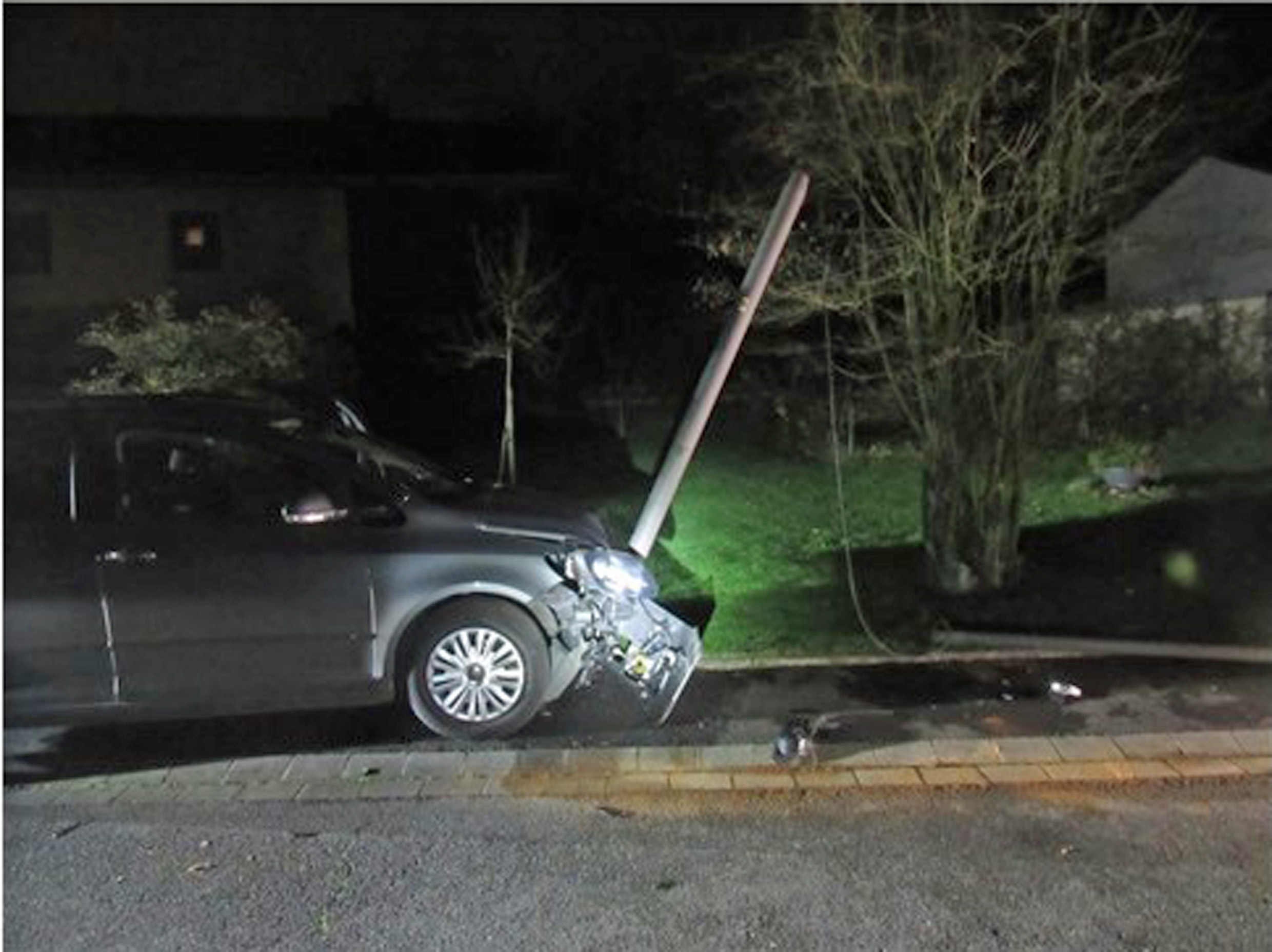 Gegen 16:45 Uhr wurde ein Anwohner durch einen lauten Knall auf einen Verkehrsunfall auf der Wiesenstraße in Heiligenhaus aufmerksam. Er sah einen VW Golf, welcher nach links von der Fahrbahn abgekommen und mit einer am Fahrbahnrand aufgestellten Straßenlaterne verunfallt war. Durch die Wucht des Aufpralls waren die Laterne sowie die Fahrzeugfront des VW massiv beschädigt worden.