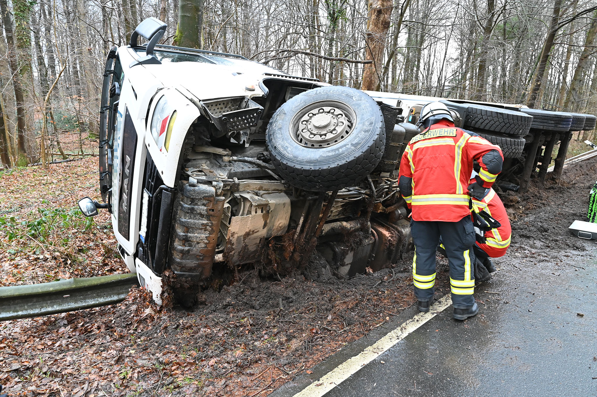 Eine LKW-Fahrerin war mit ihrem Fahrzeug von der Straße abgekommen und konnte sich nicht aus dem auf der Seite liegenden Lastwagen befreien. Den Helfern gelang es schnell die Frau aus dem Fahrerhaus zu befreien, sie wurde leicht verletzt von der Besatzung des Rettungshubschraubers "Christoph 42" versorgt. Warum die Fahrerin mit ihrem mit Kies beladenen Lastwagen auf die Bankette neben der Fahrbahn geriet, ist noch nicht bekannt. Die Bergungsarbeiten werden noch einige Zeit in Anspruch nehmen. Weiterhin muß geklärt werden, ob Kraftstoff ausgelaufen ist.