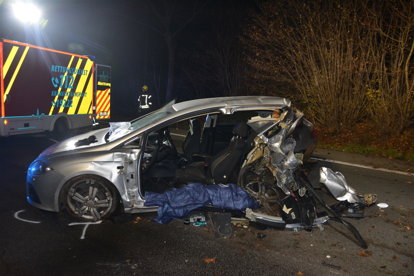 Durch die Kollision wurde der 20-Jährige mit dem Seat zunächst in den Graben und anschließend wieder auf die Fahrbahn geschleudert. Durch die starken Beschädigungen am Fahrzeug wurde der Herforder verletzt eingeklemmt. Er konnte anschließend durch die Feuerwehr herausgeholt und mit einem Rettungswagen schwer verletzt ins Krankenhaus gebracht werden. Der 28-Jährige, sowie zwei weitere Insassen im Kia wurden leicht verletzt. Für weitere polizeiliche Ermittlungen wurde der Kia vorläufig sichergestellt. Die Schadenshöhe an beiden Fahrzeugen liegt bei ca. 15.000 Euro.