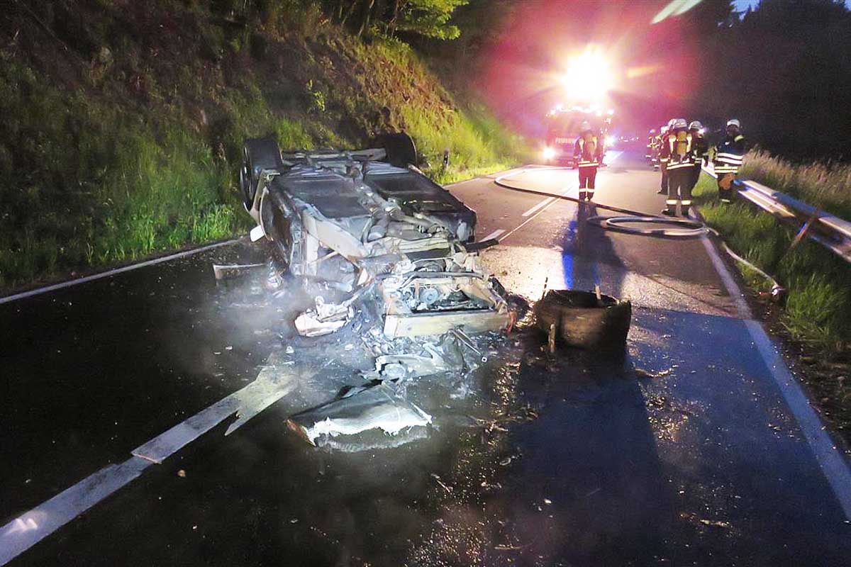 Herl - Fahrer weicht Wild aus – Sportwagen überschlägt sich und brennt aus!