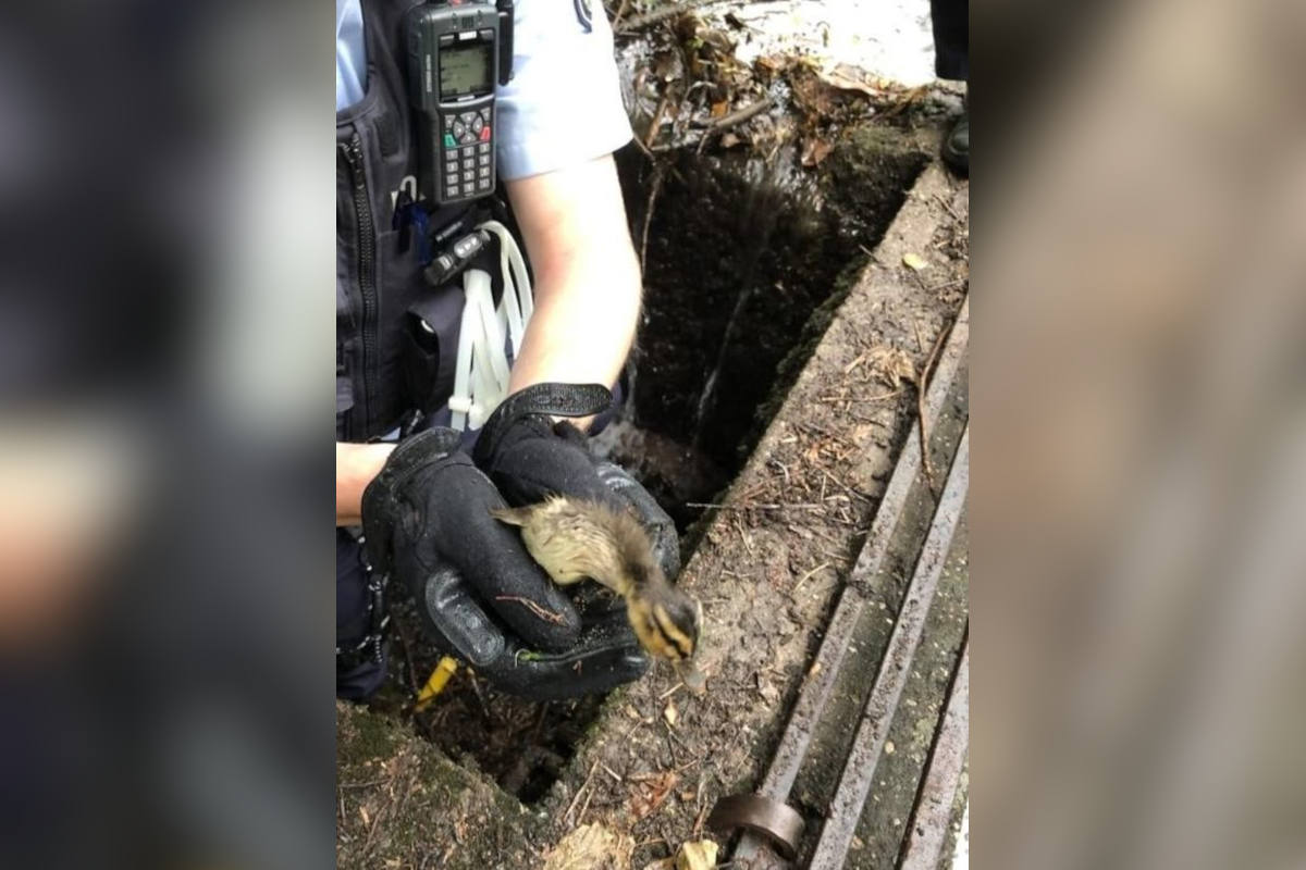 Mit vollem Körpereinsatz retten Polizisten Entenküken aus Gully
