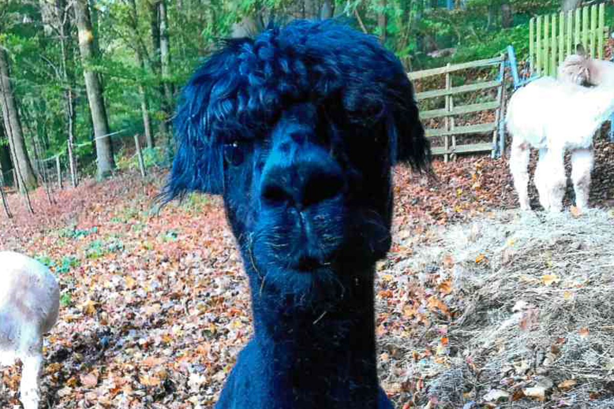 "Cosmo" ist schwarz und weißt an jeder Körperseite einen kleinen weißen Fellfleck auf. Ein Bild des Alpaka-Hengstes ist der Pressemeldung beigefügt.