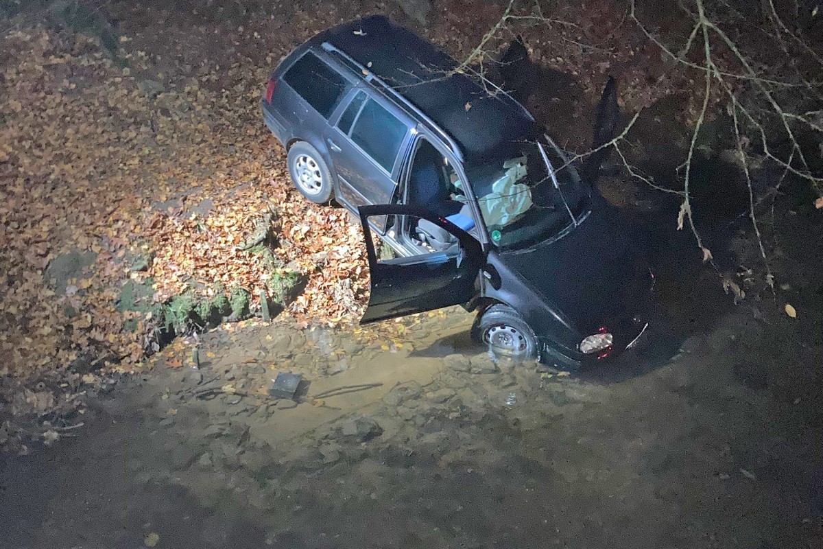Bei der Fahndung nach dem flüchtigen Fahrzeug und den beiden Personen darin setzte die Polizei auch einen Polizeihubschrauber ein - und wurde auch fündig. So stießen die Beamten im Rahmen ihrer Suche in einem Waldgebiet an der Straße "An den Göden" auf den hier erneut verunfallten VW Golf Variant. Dieser stand zur Hälfte in einem Bach - von Fahrer und Beifahrerin fehlte jedoch zunächst jede Spur.