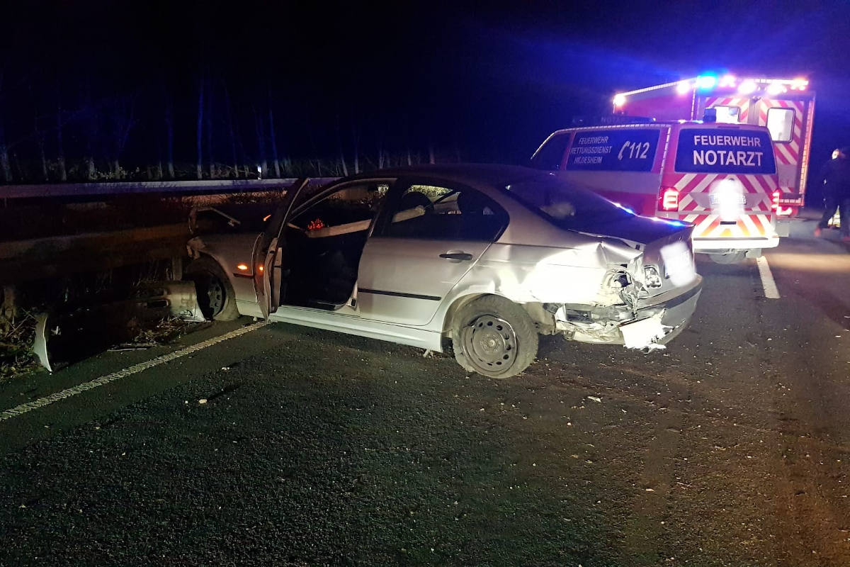 Mit ihm im Fahrzeug befindet sich ein ebenfalls 33jähriger Mann aus der Gemeinde Giesen. Kurz hinter der Brücke über den Zweigkanal verliert der BMW-Fahrer - nach ersten Ermittlungsergebnissen aufgrund eines geplatzten Hinterreifens - die Kontrolle über sein Fahrzeug. In der weiteren Folge prallt der Pkw zweimal in die Außenschutzplanke, wird schließlich von dort abgewiesen und schleudert über beide Fahrstreifen in die Mittelschutzplanke. Dort bleibt der Pkw totalbeschädigt stehen. Nachfolgende Verkehrsteilnehmer sichern die Unfallstelle bis zum Eintreffen der eingesetzten Funkstreifenbesatzung ab.