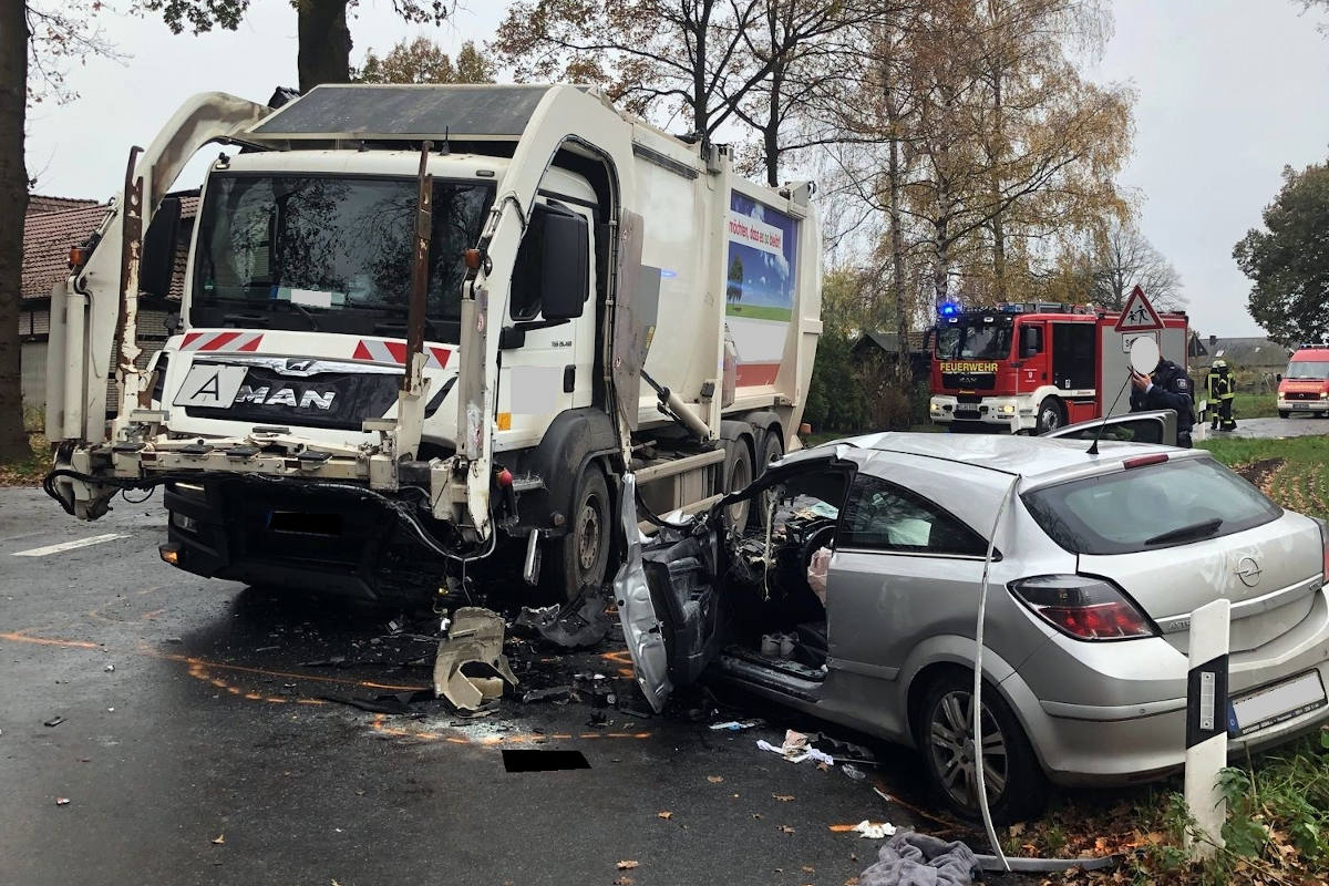 Am Freitagmorgen wurden die Beamten zu einem schweren Verkehrsunfall auf die Brennhorster Straße nach Hille gerufen. Ein 20 Jahre alter Opel-Fahrer aus Diepenau wurde bei der Kollision mit einem Müllwagen schwerstverletzt. Der Lastwagenfahrer erlitt, offenbare leichtere Verletzungen.