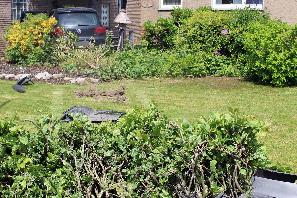 Dabei überfuhr der PKW offenbar ungebremst zunächst ein Feld sowie anschließend eine Hecke und die anschließende Rasenfläche, bevor er in einem Gebüsch vor der Wand des dortigen Hauses zum Stehen kam.