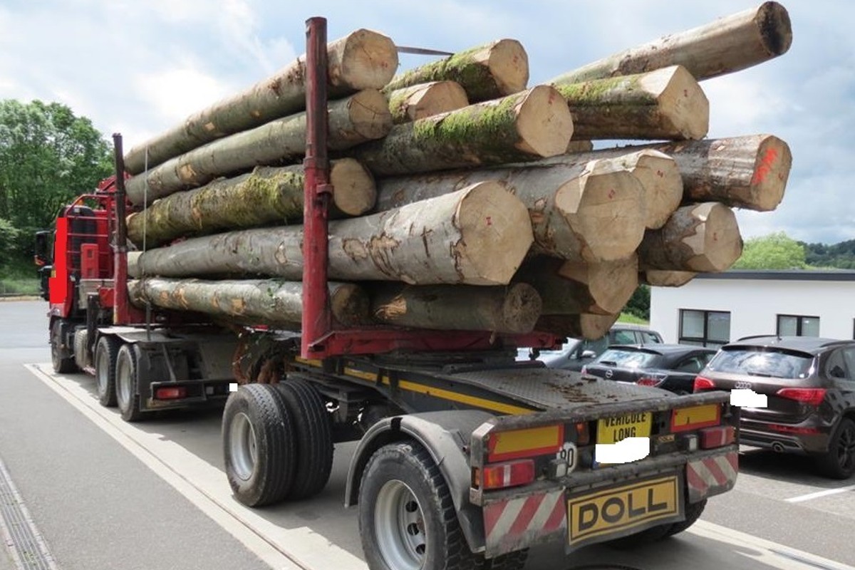 Nachdem der Fahrer einen Teil der Buchenstämme abgeladen hatte, durfte er seine Fahrt fortsetzen. Den Fahrer, zugleich Verantwortlicher des Unternehmens, erwartet nun ein Bußgeld.