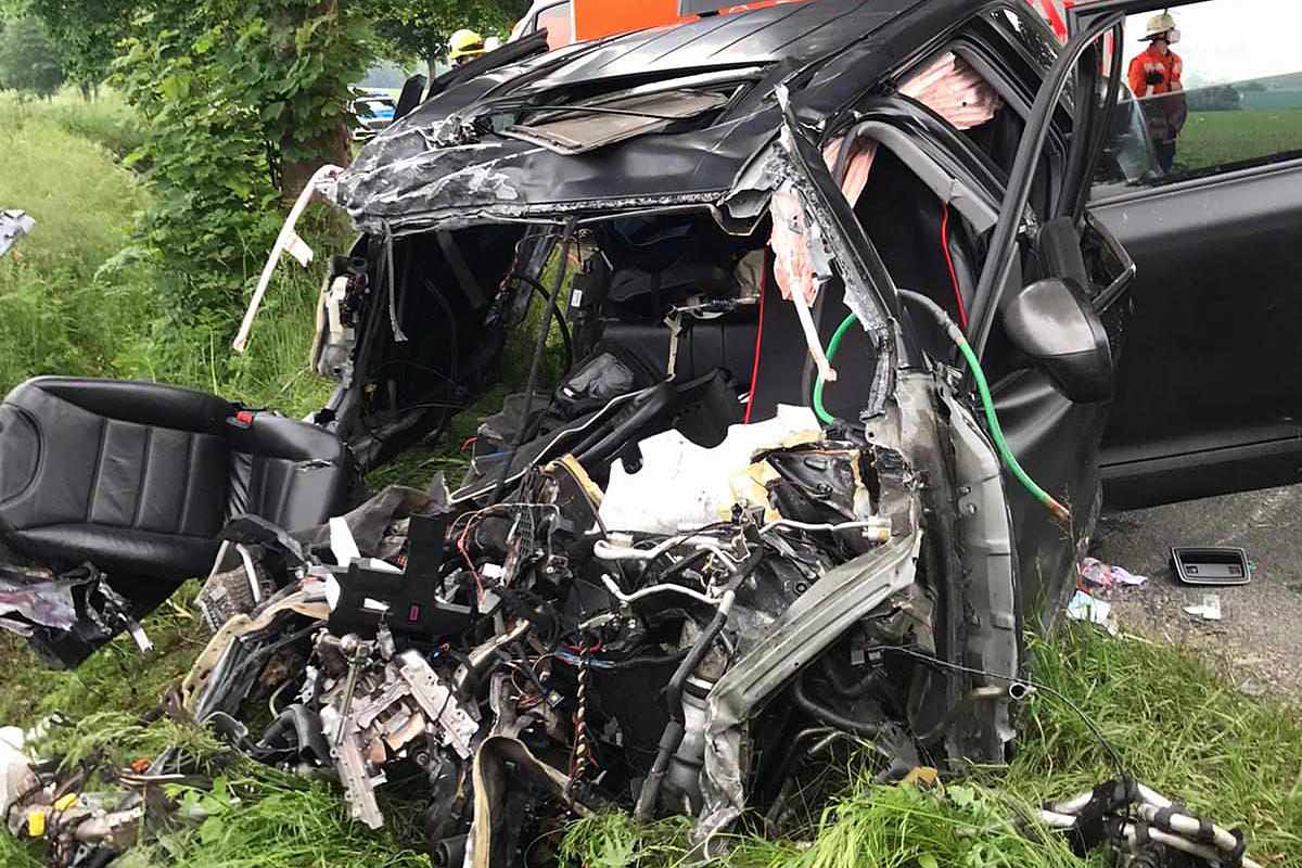 Totalschaden. Der Motorblock wurde durch die Wucht des Aufpralls herausgerissen und fing an zu brennen. Durch das Feuer wurde auch der Böschungsbereich in Mitleidenschaft gezogen.