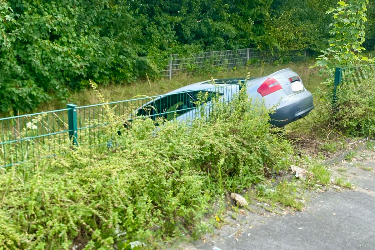 In Hünxe ist ein Auto am Freitag, 25. Juli 2025, auf dem Parkplatz eines Discounters von der Fahrbahn abgekommen und in einen Graben geraten. Ein Feuerwehrmann leistete vor Ort Erste Hilfe.