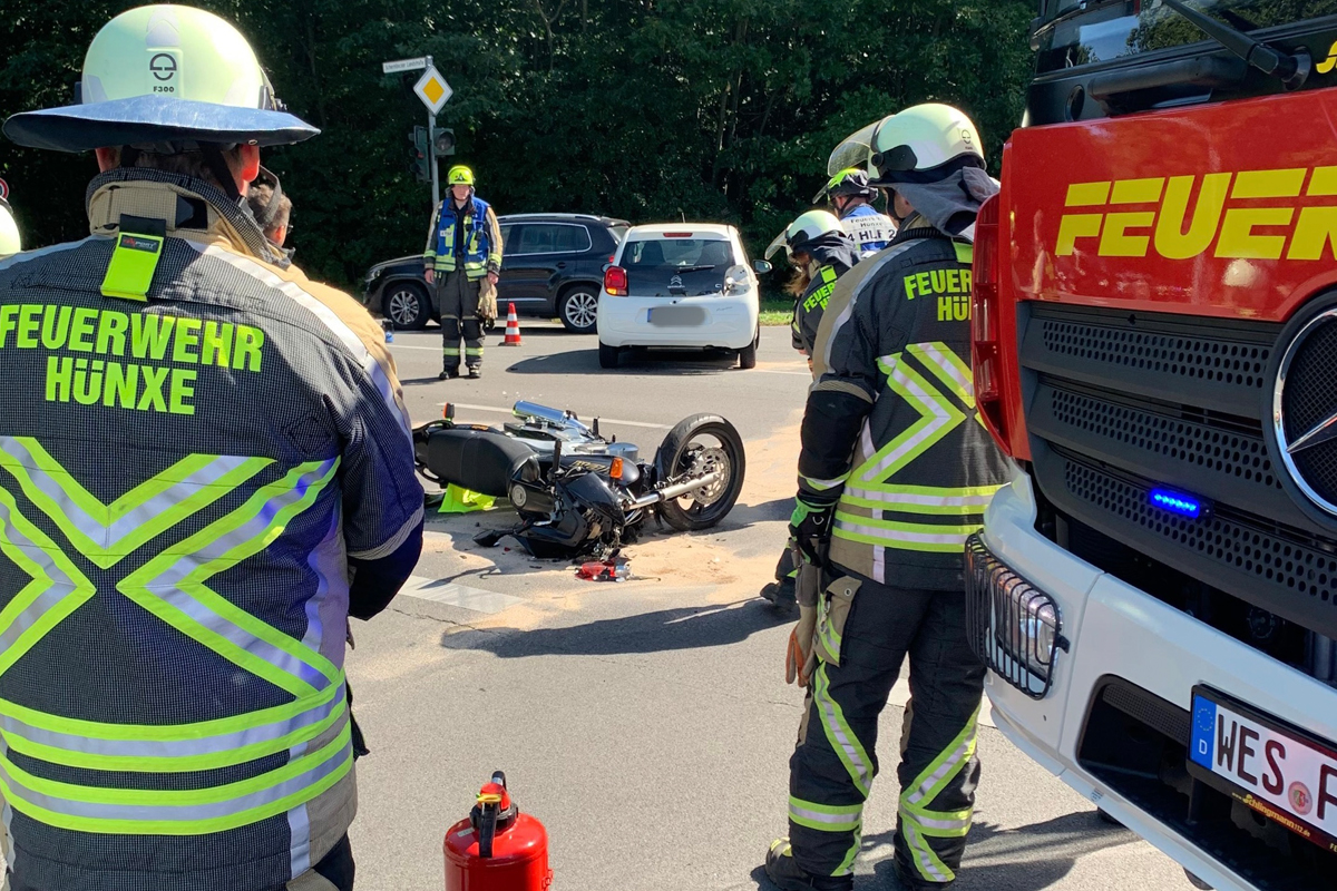 Ein Pkw und ein Motorrad kollidierten bei dem Unfall. (Bildquelle: Freiwillige Feuerwehr Hünxe)