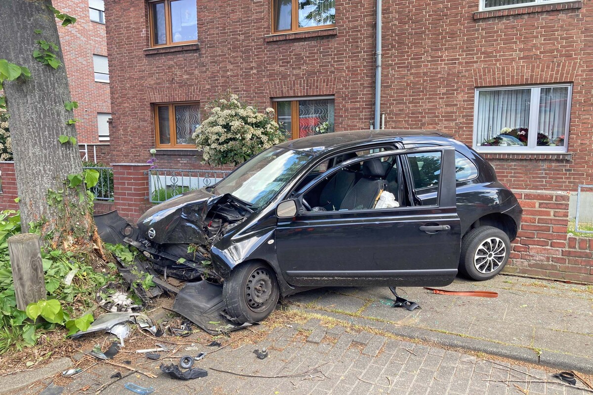 Durch das Ausweichen soll sich der Nissan aufgeschaukelt haben, so dass er letztlich nach rechts von der Fahrbahn abkam. Mit der Front stieß das Auto dann gegen einen Baum. Anschließend verkeilte sich das Heck in einer angrenzenden Grundstücksmauer.